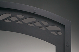 - Stacked textured refractory panels with integrated ash lip and decorative cast iron log retainer